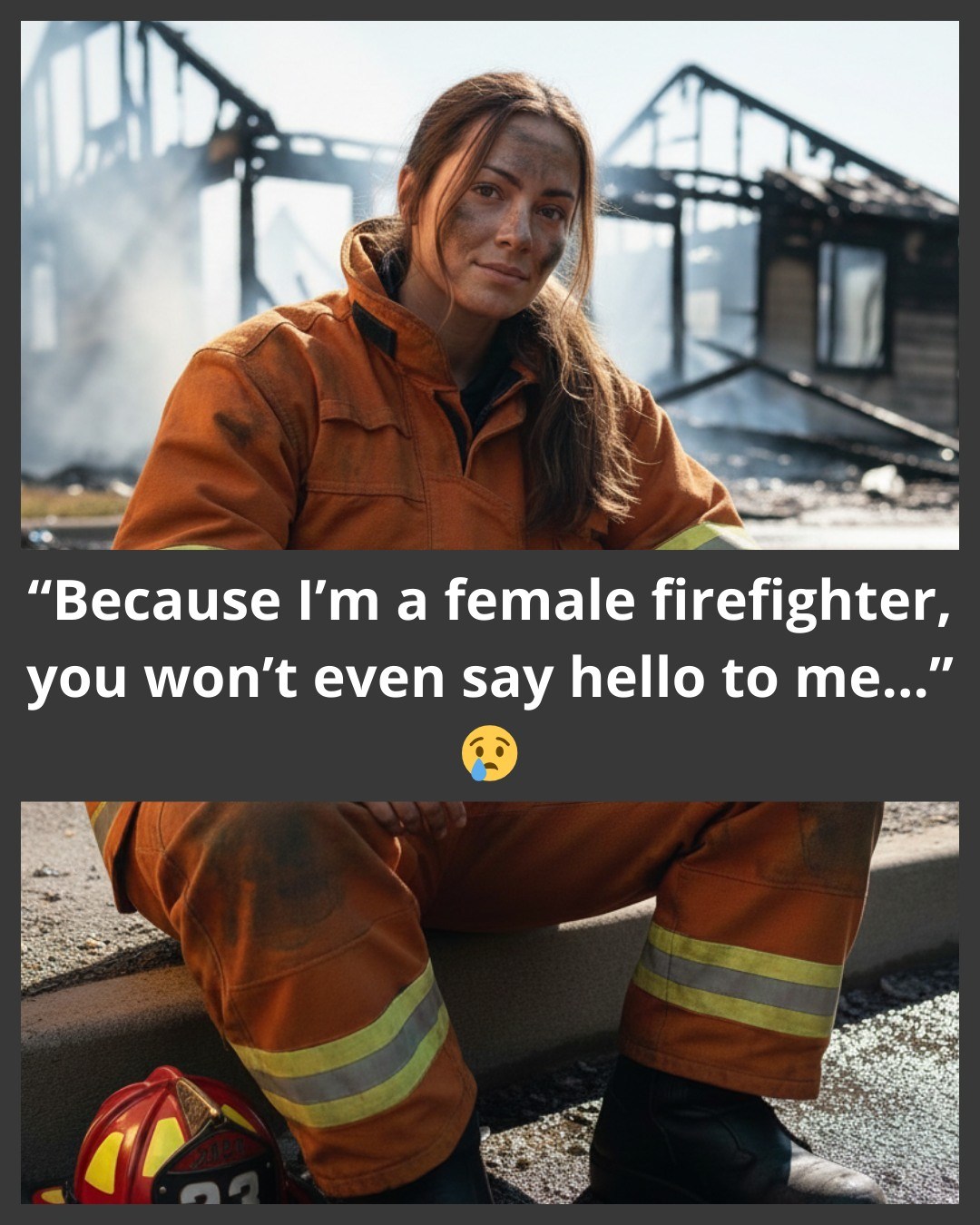 Tonight, after battling a fierce house fire, she sits on the curb, her body trembling, her lungs heavy from smoke and exertion. The flames are gone, the house stands no longer in danger, but the exhaustion, the fear, and the memory of what could have been still weigh on her . Her uniform is smudged with ash, her hands blistered, her hair damp with sweat, and yet, in her eyes, there is quiet resolve.