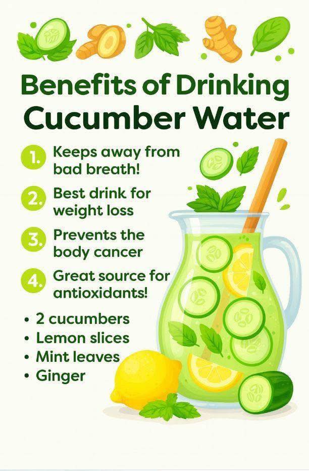 Cucumber water supports hydration, which is important for digestion, skin health, and energy levels. Adding lemon and ginger can provide vitamin C and support digestion.
