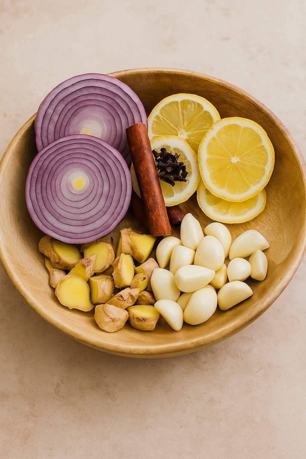 Ingredients:1 medium onion (sliced)1 lemon (sliced with peel)4–5 cloves of garlic1 piece of fresh ginger (about 2 inches, sliced)1 stick of cinnamon5–6 cloves3 cups of water